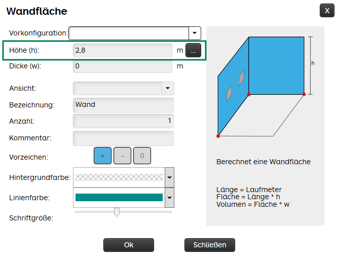 Über ein Eingabefenster kannst du dem Aufmaß Programm die Höhe der Wände mitteilen. Fenster und Türen kannst du dabei ganz einfach abziehen und Laibungen hinzufügen.